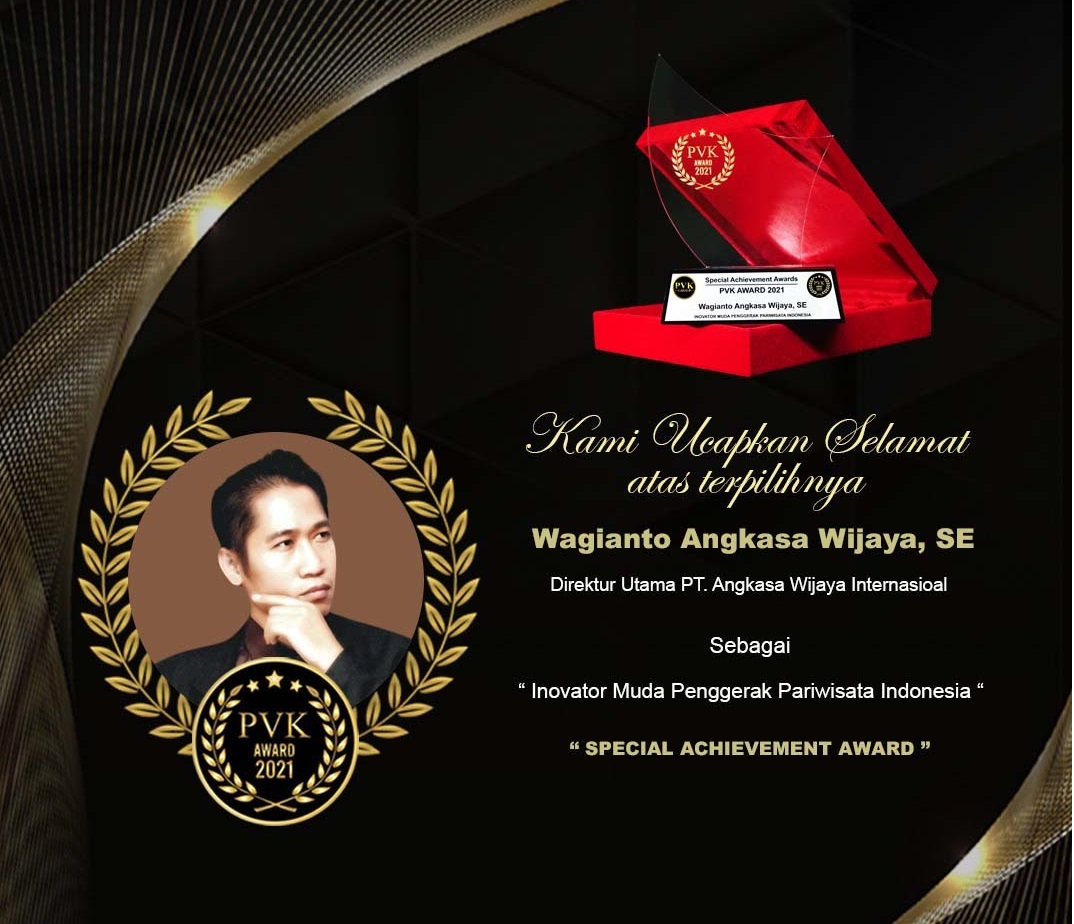- Wagianto Angkasa Wijaya, SE., memperoleh anugerah penghargaan PVK Award 2021 untuk kategori Inovator Muda Penggerak Pariwisata Indonesia,
