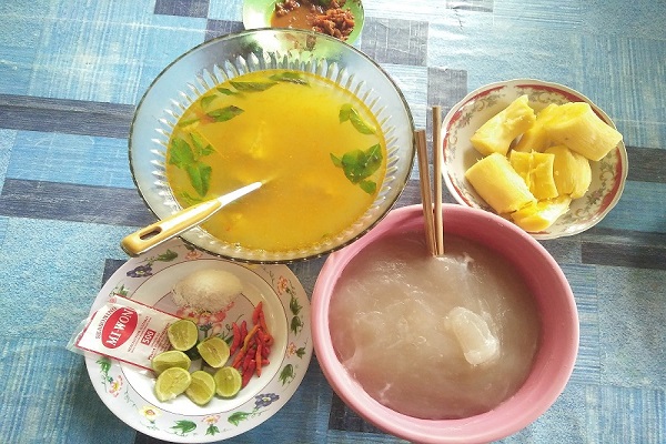 Rasa asam dari kuah ini diperoleh dari irisan lemon. Irisan lemon yang diperas di kuah ikan kemudian disajikan bersama onyop.