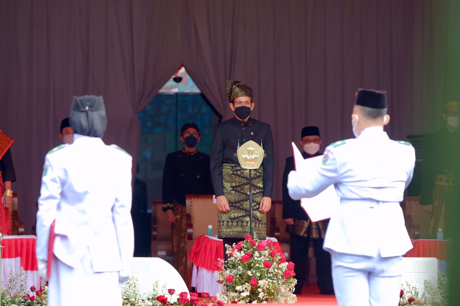 PARIWISATAINDONESIA.ID – Menteri Pendidikan, Kebudayaan, Riset, dan Teknologi (Mendikbudristek), Nadiem Anwar Makarim memimpin Upacara Peringatan Hari Sumpah Pemuda ke-93 secara langsung di kompleks Kemendikbudristek, Senayan, Jakarta Selatan, Kamis (28/10/2021). Mendikbudristek mengenakan pakaian adat asal Provinsi Riau.